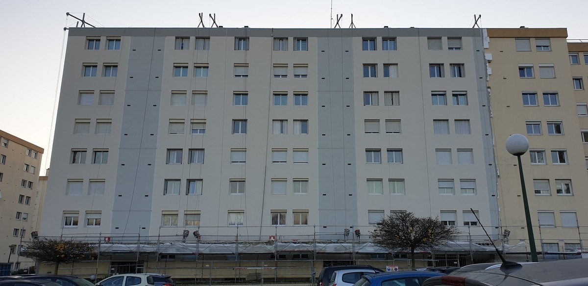 Il est lauréat des trophées des meilleures rénovations énergétiques en copropriétés de de Paris-Saclay. Ce trophée a été organisé dans le cadre du programme Rénovons Collectif, financé par le dispositif des certificats d’économies d’énergie. Les travaux de rénovation ont eu pour objectifs de réduire les dépenses énergétiques et d'offrir une nouvelle identité visuelle aux bâtiments. Les bâtiments, construits en 1972, se caractérisent notamment par des façades dégradées (épaufrures, éclats de béton, parois ruisselantes en période de froid), de la présence de moisissures autour des fenêtres et la présence de ponts thermiques. Les logements ne possèdent pas de ventilation mécanique et les chaudières, âgées de 25 ans, sont vétustes. Suite à un audit énergétique réalisé en janvier 2018, les travaux de rénovation énergétique, votés en Assemblée Générale en juin 2018, ont consisté à améliorer la qualité thermique de l'enveloppe avec la mise en œuvre d'une isolation thermique par l'extérieur associée au ravalement des façades. L'étanchéité des balcons est également reprise et les garde-corps sont remplacés. Les dalles des planchers bas ont été isolées dans le cadre de cette rénovation. Il est également effectué le remplacement des menuiseries en bois à simple vitrage existantes, tant privées (5%) que collectives, par des menuiseries en PVC à double vitrage. Côté équipement, de nouvelles chaudières à condensation sont installées dans la chaufferie. Elles assurent également la production d'ECS. Les réseaux de distribution ont été équilibrés, isolés et améliorés. Les radiateurs d'origine ont été remplacés par des radiateurs basse température équipés de robinets thermostatiques à double réglage. Enfin, le système ventilation a été amélioré avec la pose d'une ventilation mécanique basse pression. . Au final, le bouquet de travaux proposé a permis de réduire les consommations énergétiques d'un facteur 2 et les émissions de GES d'un facteur 2,1. Cette fiche présente les solutions techniques et économiques retenues par le maître d'ouvrage. |